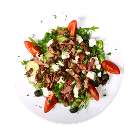 Lardons, olives, pommes de terre, vinaigrette.
